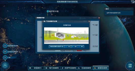 (4)东北亚多能源能量平衡仿真:通过多能源能量平衡仿真实验,了解各地区能源需求的差异性,理解能源之间的相互转化关系及其重要意义,熟悉环境、经济等因素与能量平衡的相关性,掌握能源互联网能量平衡的分析方法。实验中,学生可以探究各国不同能源转换比例下的能量消费模式,及相应的多能源互联系统能量平衡方式,主动探索与理解能源替代的意义与作用(图7)。