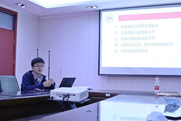 活动第二部分,支部党员王明旭同志分享了疫情期间在家乡做的一些志愿工作。疫情刚开始,村里下发封村通知后,王明旭同志主动联系并临时加入了村支部,和村支部中党员同志一起参与疫情防控工作,为照顾村中年纪大一些的党员的身体,王明旭同志主动承担起值夜班的工作,并且和支部其他党员一起开展防疫消杀工作,加强宣传引导,提升村民的防控意识等。发展对象张志源同志也分享了一些作为抗疫人员家属的一些体会,他的母亲是一名医生,疫情期间早出晚归,回家还要特别注意家人的安全。在这场重大的抗疫战争中,还有很多无畏的心和奉献的人,听了支部优秀党员同志的抗疫行动,姜心怡同志表示支部党员都应该向王明旭同志学习,也应该承担起党员的责任,接着向大家分享了几个抗击疫情时期英雄的事迹:山东大学齐鲁医院呼吸与危重症医学科主管护师张静静和湖南“95后”护士胡佩等。