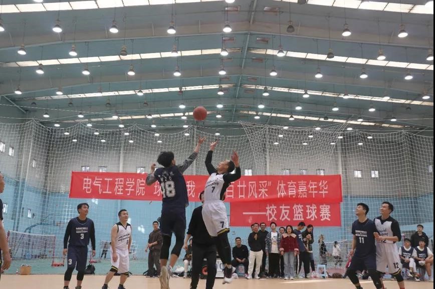 校友篮球赛由在校生组成的“新能源队”对战学院校友组成的“电力青年队”,累计总得分率先达到120分的队伍赢得系列活动的最终胜利。在四节篮球对抗赛之余,比赛还增设了趣味篮球项目,整场比赛跌宕起伏,最终“电力青年队”以微弱的优势取得胜利。处于时代芳华的电气学子以拼搏的汗水、丰富的学识、激昂的青春献礼山大百廿校庆。