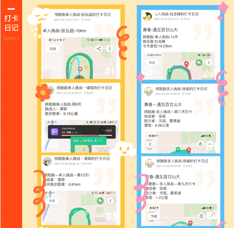“拼跑跑——全民运动季”采用线下运动、线上打卡的形式,分为单人挑战和团队挑战,以14天为限,参加挑战的同学需在规定时间段内完成累计绕操场跑步120圈的挑战,并打卡记录。活动累计报名252人,历时14天。此次活动推进了电气研究生体育锻炼的持续性和积极性,同时活动以120圈为打卡目标,献礼山东大学120周年校庆,表达了对百廿山大的美好祝愿。