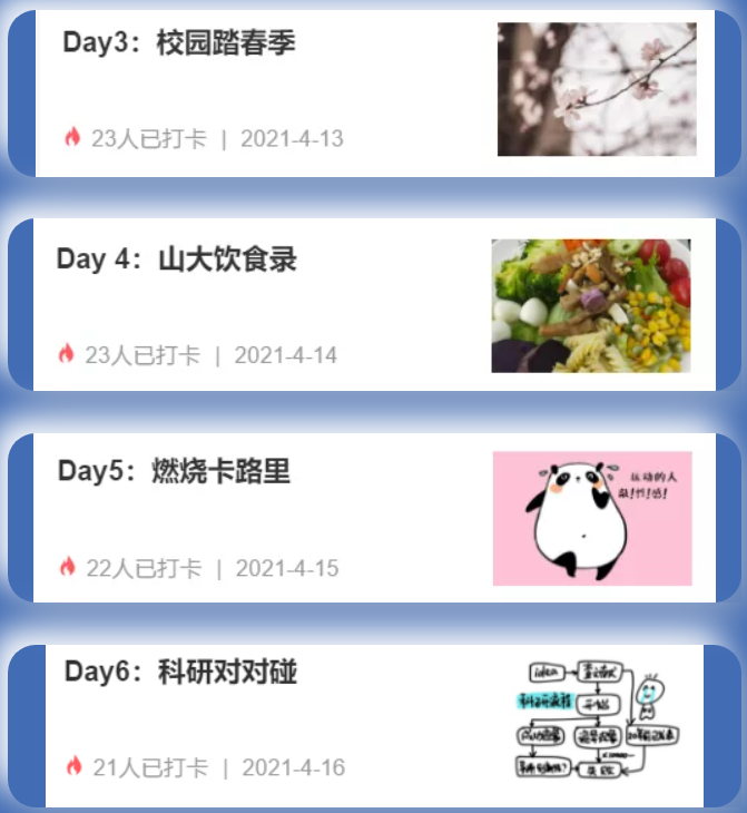 “我与山大的‘前世’今生”采用线上打卡的形式,借助“小打卡”平台,由发起人每日发布打卡任务,参与同学根据主题分享自己与山大的小故事。研会带领着各位学子回顾了自己了解山大、认识山大、学在山大的点点滴滴,了解了山大百年来的历史沉淀,并通过自身感悟不断激励自己,提升自己,见证自己的成长。